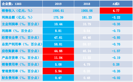 实现主营业务收入5359.72亿元,同比增长7.37%、 比上年下降1.70个百分点。 净增368.09亿元,比上年的492.38亿元减少25.24%。企业主营业务收入平均规模12167万元,同比增加836万元。