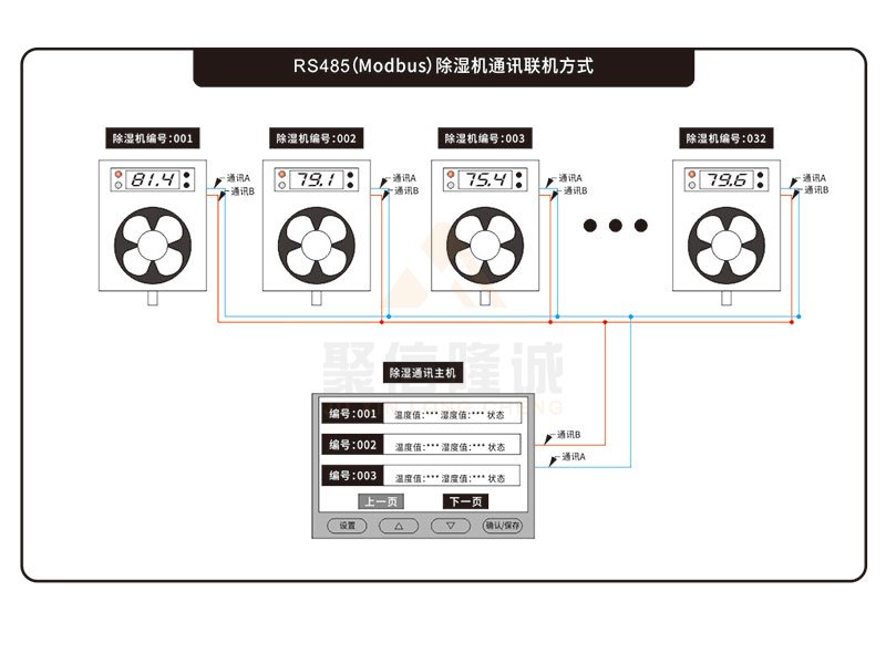 系统主要由:一台主机和若干台(1~32台)抽湿器子机构成;抽湿器子机主要负责数据采集、环境控制和数据上传;主机主要负责:数据分析、数据保存和相关参数设置。主机与抽湿器子机之间采用485通讯连接。